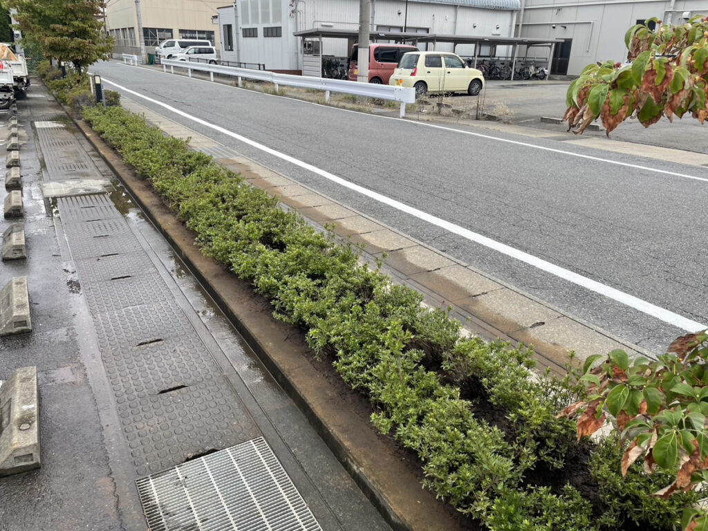 今回は「通行の安全確保」と「見た目の統一感」を重視し、歩道側へ張り出している枝葉を中心に、全体のラインが揃うよう剪定・整枝を行いました。あわせて、落ち葉や刈り草の回収・清掃まで実施し、作業後すぐにきれいな状態をご確認いただけるよう仕上げています。