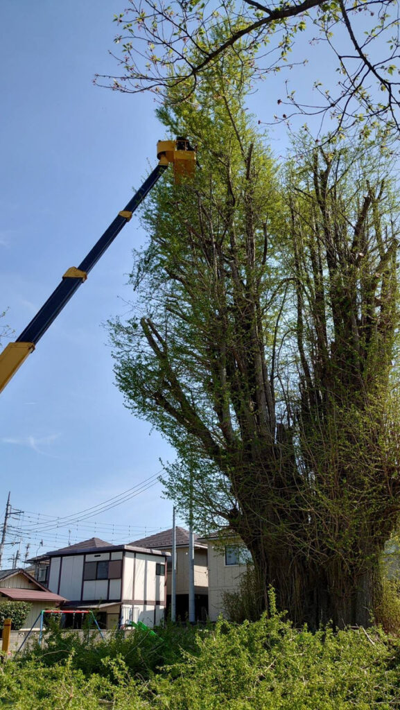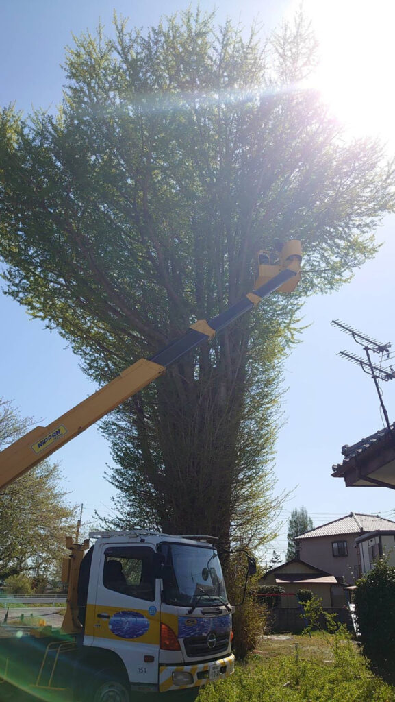 今回の現場は高木で、周辺への影響も考慮する必要があったため、高所作業車を用いて上部から段階的に伐採する方法を選択しました。