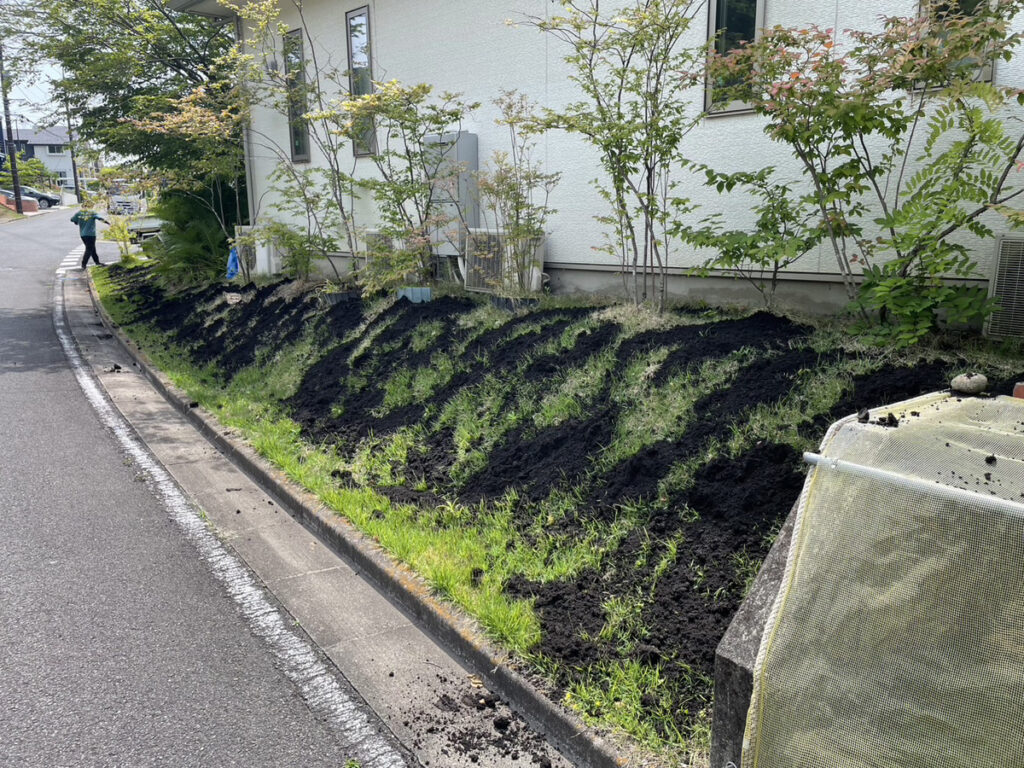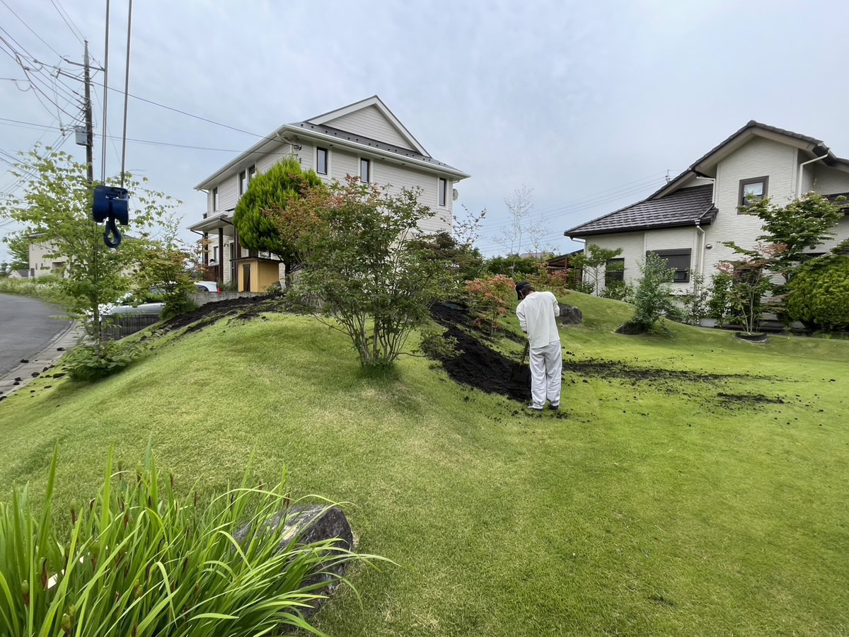 今回は芝の状態を確認し、全体を整えたうえで目土を入れて表面を均し、芝が根付きやすい環境へ整備しました。見た目が整うだけでなく、今後の生育を助けるメンテナンスです。