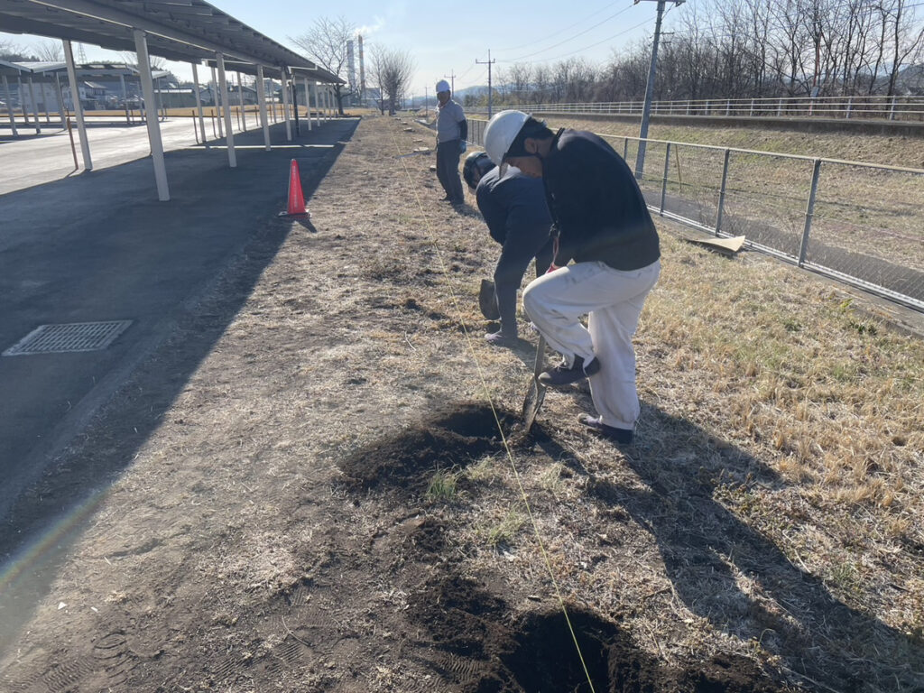 まずは植え付け位置を確認し、並びがきれいに見えるよう間隔を調整しながら位置出しを行いました。その後、一本ずつ丁寧に掘削し、植栽に適した状態を整えてから作業を進めています。