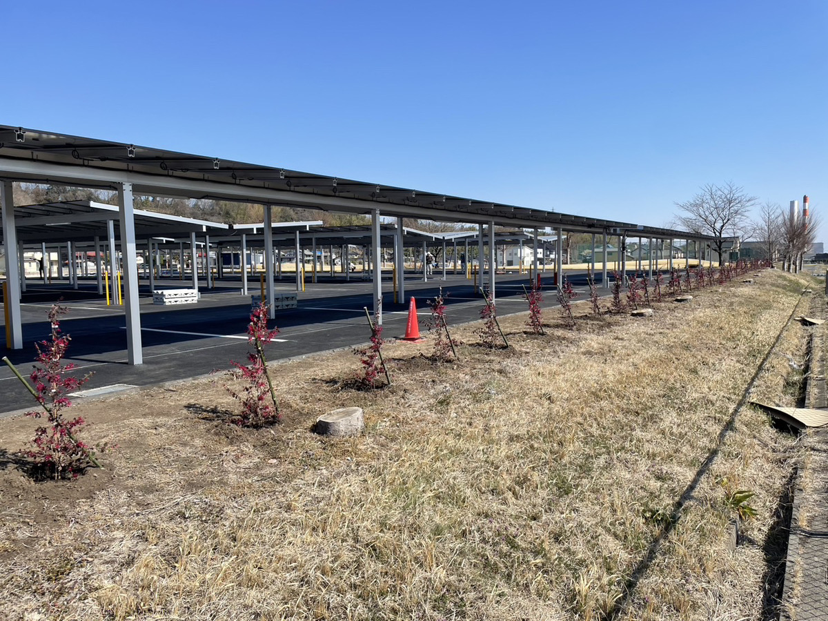 今回の施工では、駐車場沿いに植栽がきれいに並ぶよう、位置や間隔の見え方を確認しながら丁寧に作業を進めました。