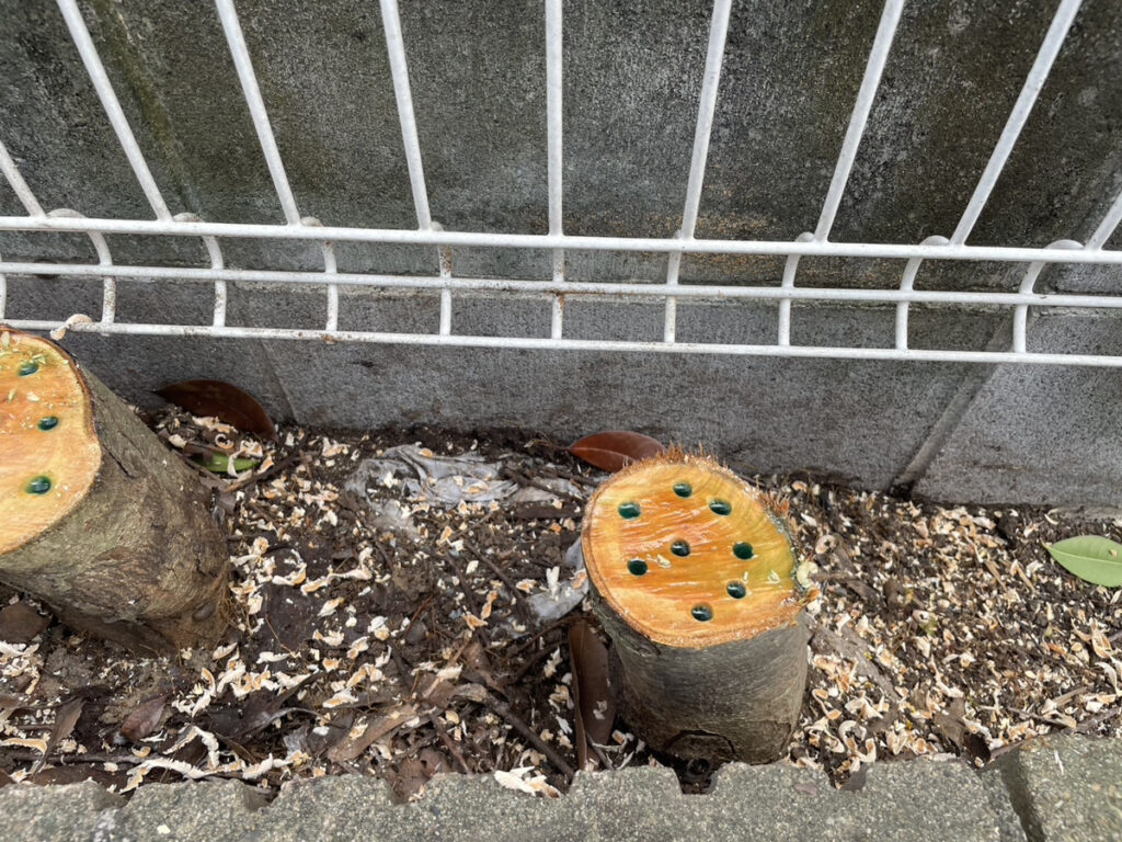 伐採後は、切り株からのひこばえ(再生)を抑える目的で、切り口に穴あけ→除草剤注入の処理を実施しています。